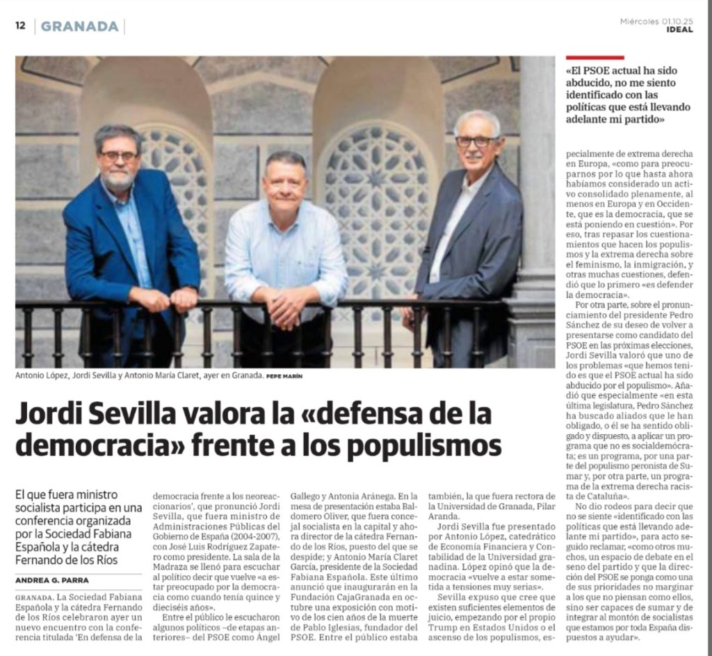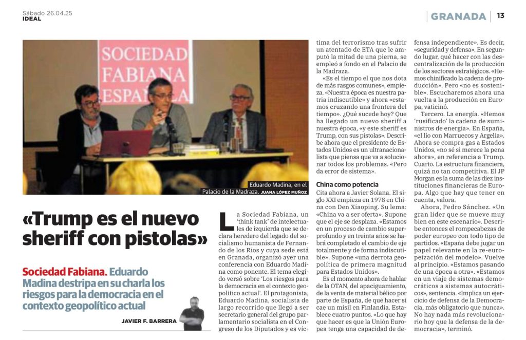 La Sociedad Fabiana Española es una organización de la sociedad civil constituida recientemente en Granada, con la participación de académicos y profesionales. Inspirada en el socialismo democrático y el humanista, promueve la reflexión, el debate y la educación en temas sociales y políticos.